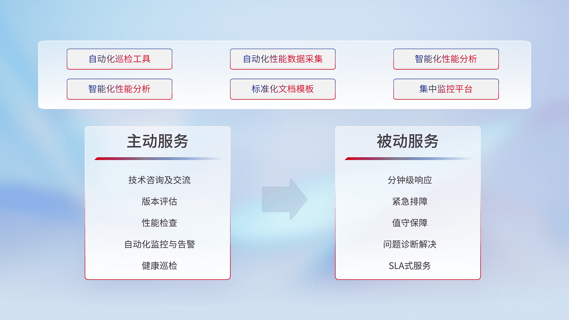 智能化工具和标准化文档,,,,保障服务质量,,,,提供主动服务(包含技术咨询、、、版本评估、、、性能检查、、、自动化监控与告警、、、、健康巡检)和被动服务包含(分钟级响应、、、、紧急排障、、、、值守保障、、、问题诊断解决、、、SLA服务)。。。。